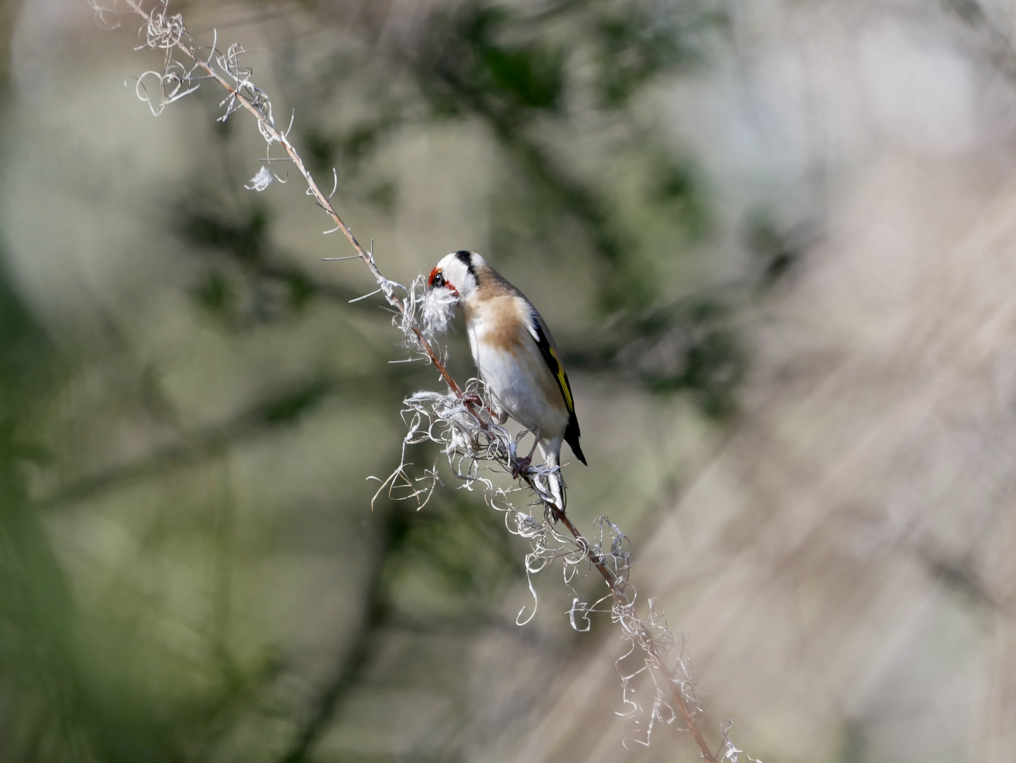 A goldfinch collects rosebay willowherb seeds, Cathays Cemetery