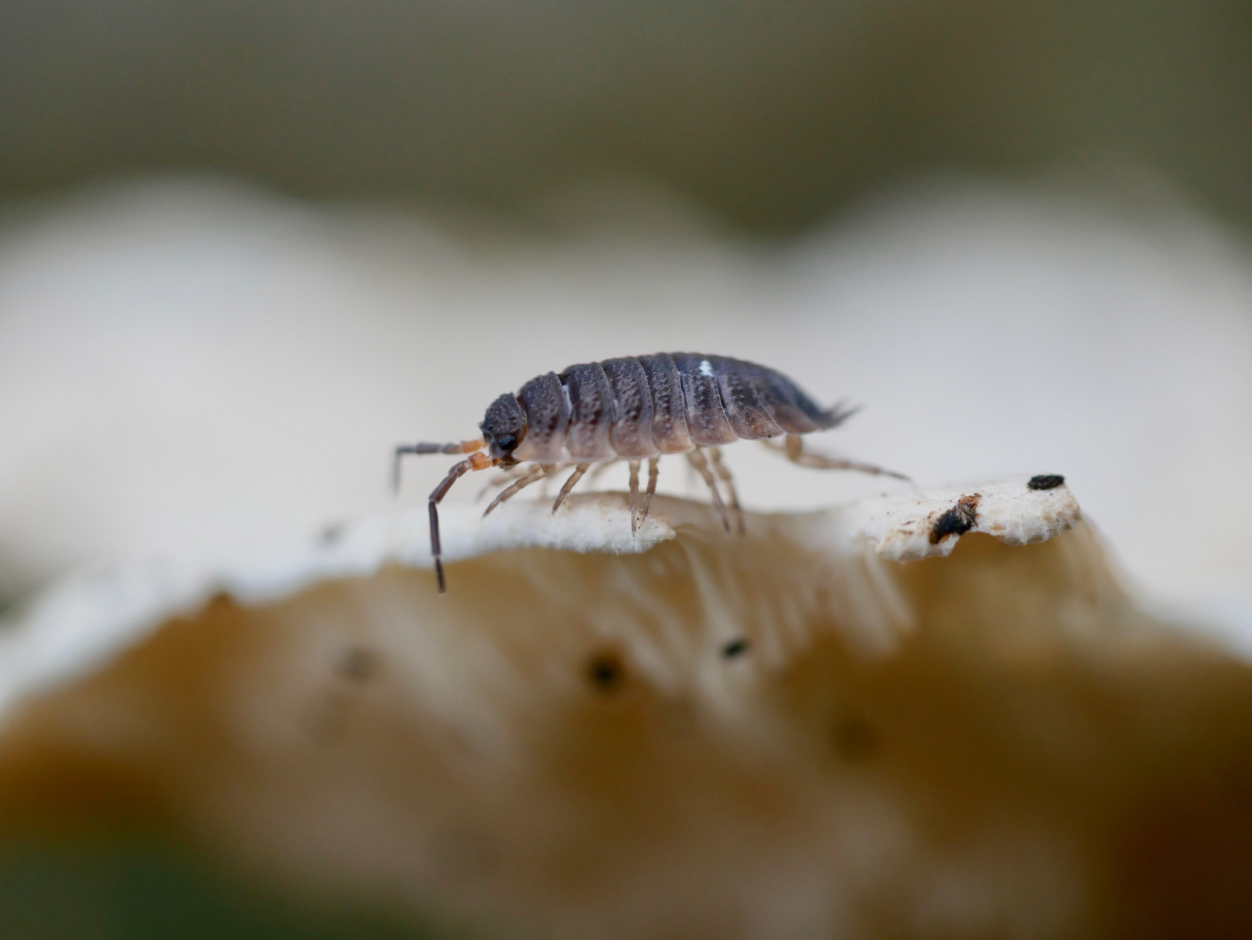Common rough woodlouse (Porcellio scaber) on mushroom, Cathays Cemetery