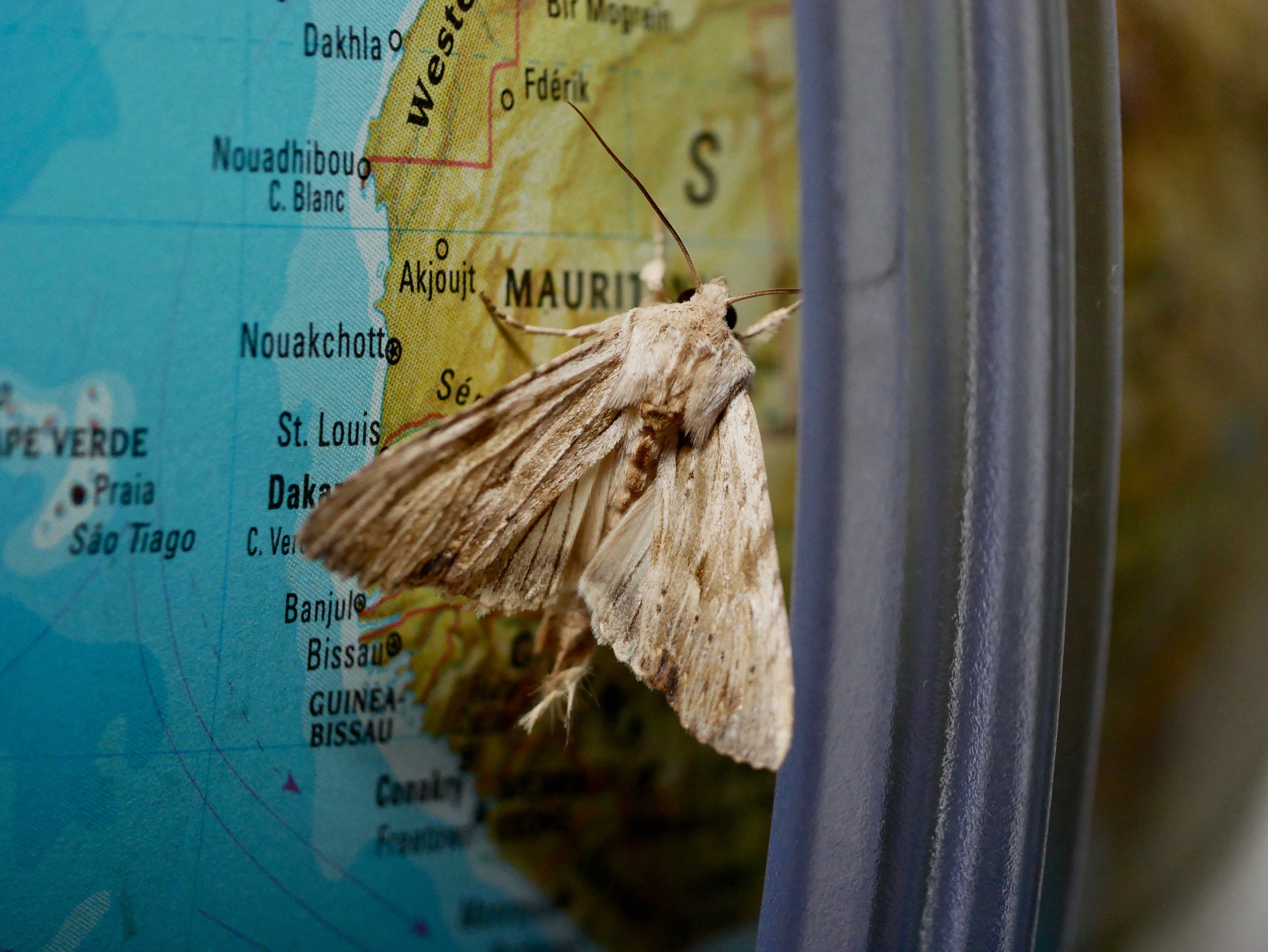 Light arches moth (Apamea lithoxylaea) on globe